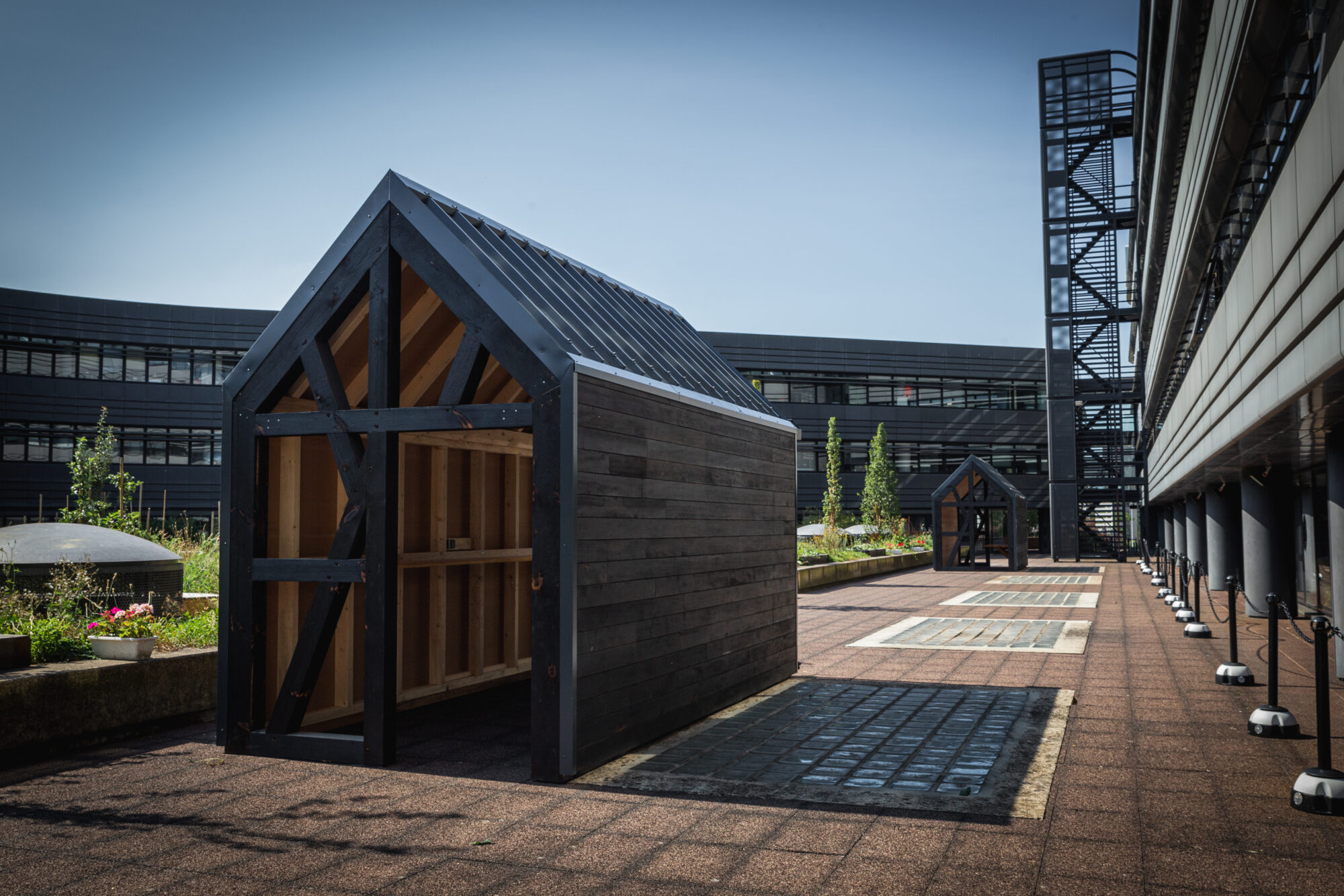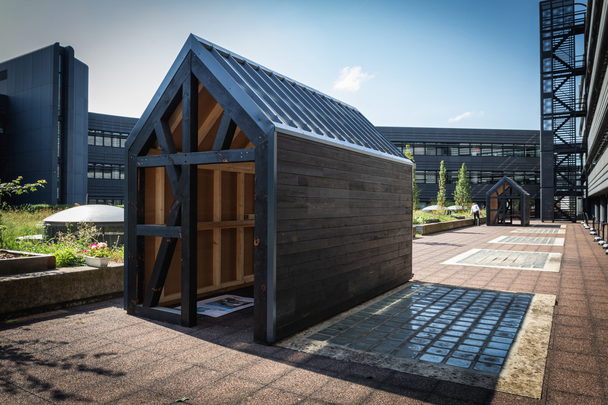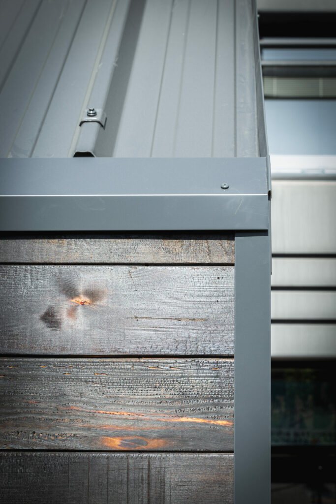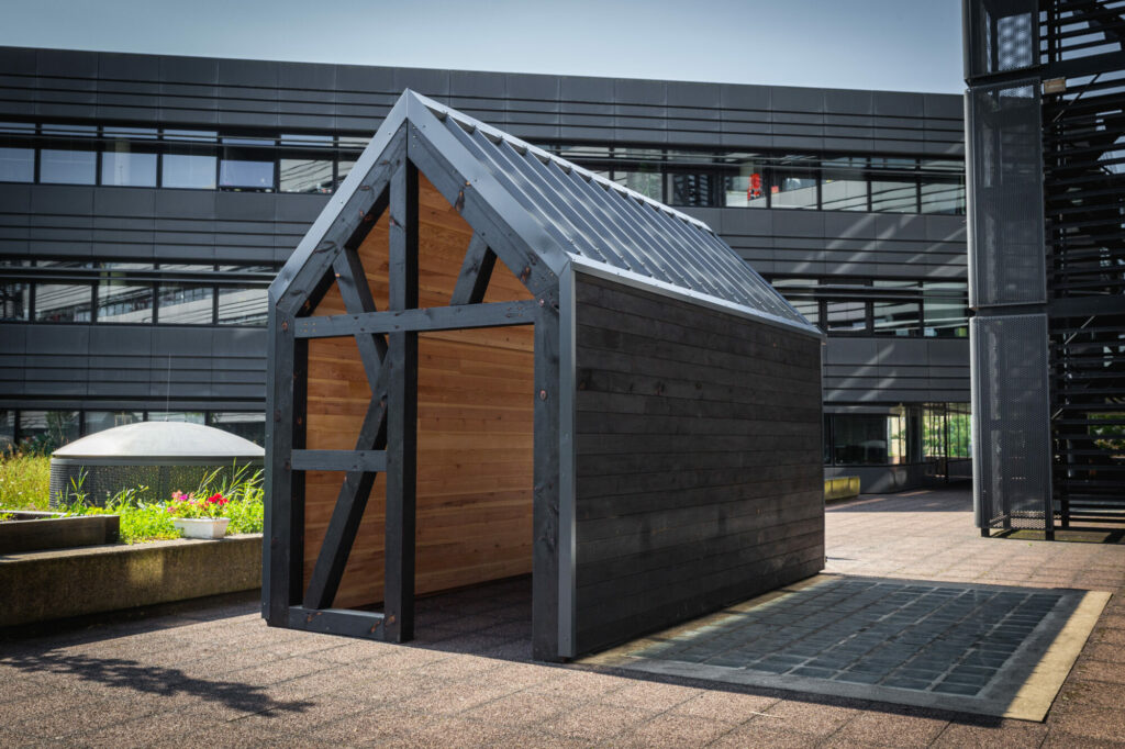 Deux modules D’woch ÜTE ont été livrés avec une finition en pin brûlé et une toiture en bac acier anthracite.
