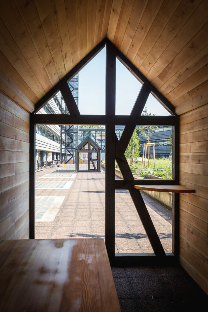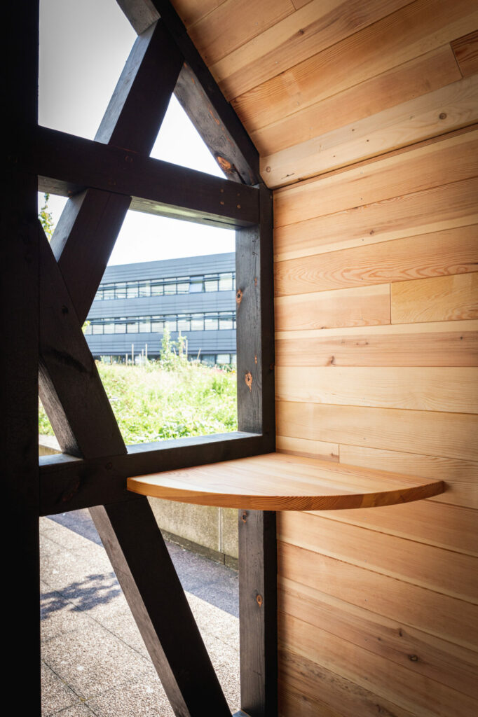 À l’intérieur du module dédié au travail, nous avons dessiné et assemblé une grande table murale, permettant d’accueillir jusqu’à cinq personnes. Deux tablettes façon mange‑debout ont également été intégrées au niveau des colombages pour offrir des espaces individuels de travail.