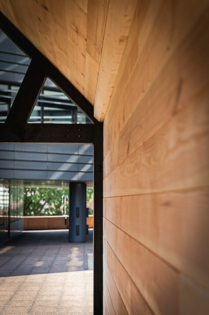 Une demande particulière concernait l’intégration d’un colombage : nous avons donc conçu et intégré un “Mann”, un colombage en K, réalisé en pin massif et brûlé pour en préserver l’esthétique.